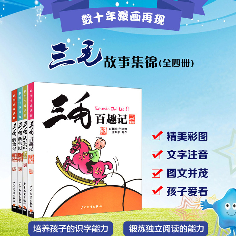 三毛流浪记全集三毛从军记+百趣记+解放记+新生记漫画书彩共4册图注音版少年儿童出版社张乐平经典6-8-12周岁 新华书店正版