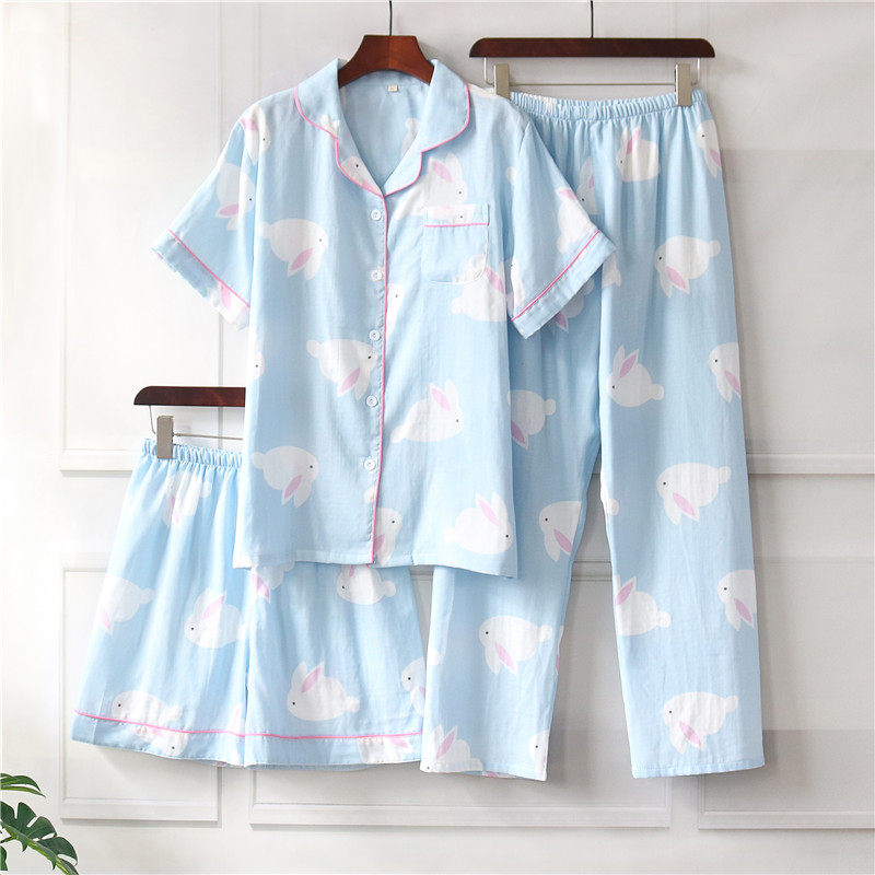 棉纱睡衣三件套女夏季短袖长裤短裤纯棉纱布春秋全棉家居服套装薄