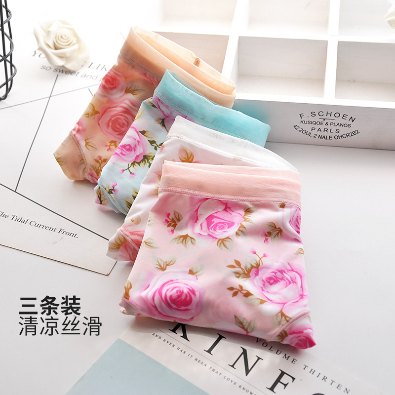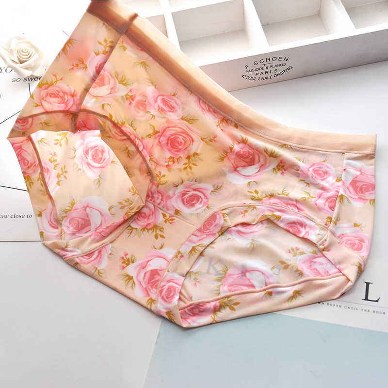 夏季中腰冰丝无痕速干内裤女轻薄柔软透气舒适玫瑰印花性感三角裤