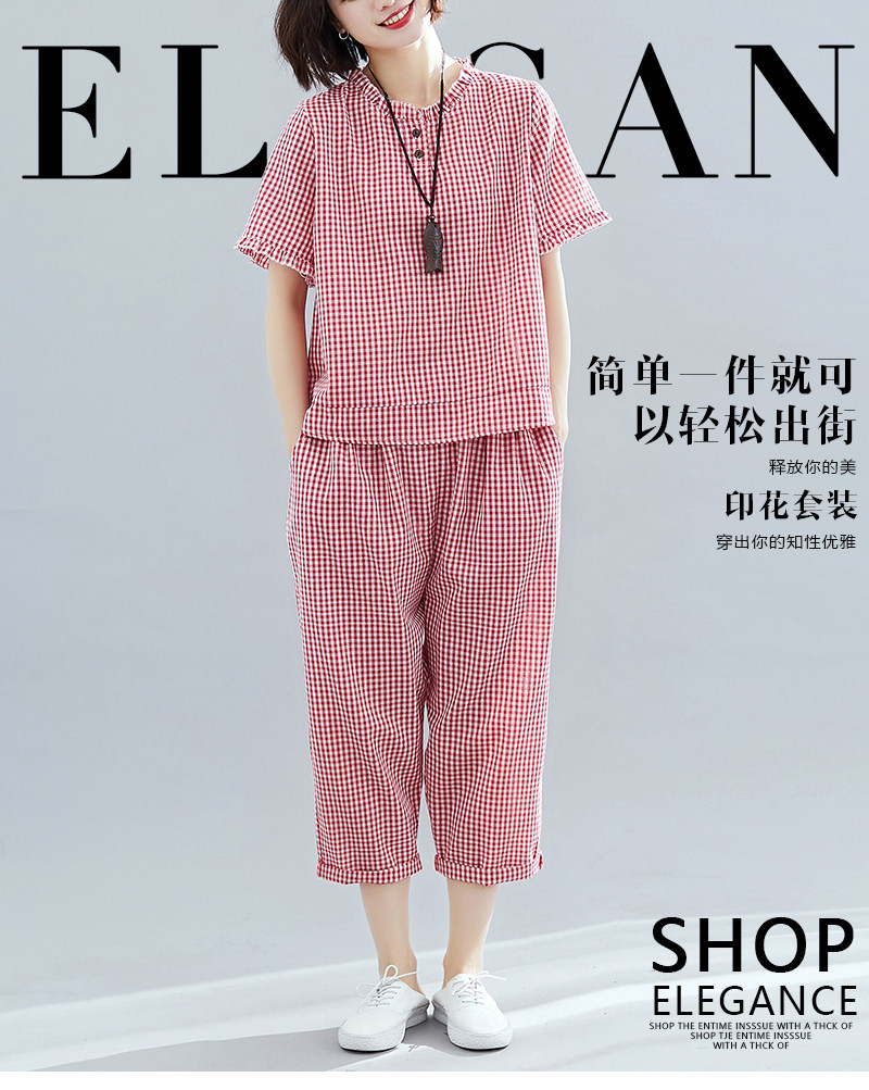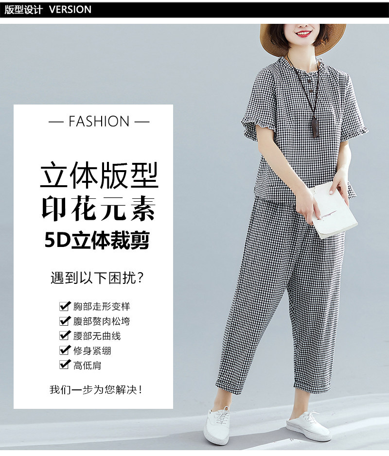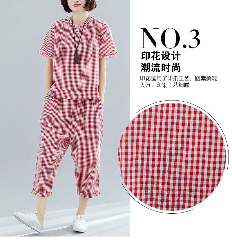 棉绸套装夏人造棉睡衣女绵绸格子大码纯棉家居服休闲可出门年轻薄