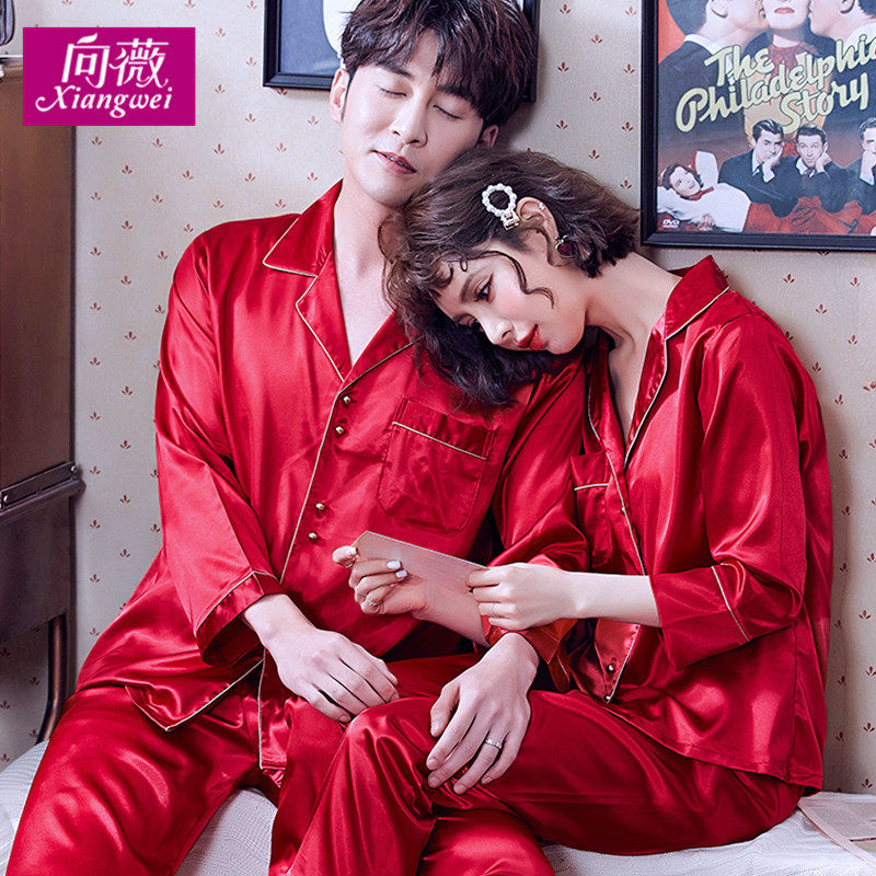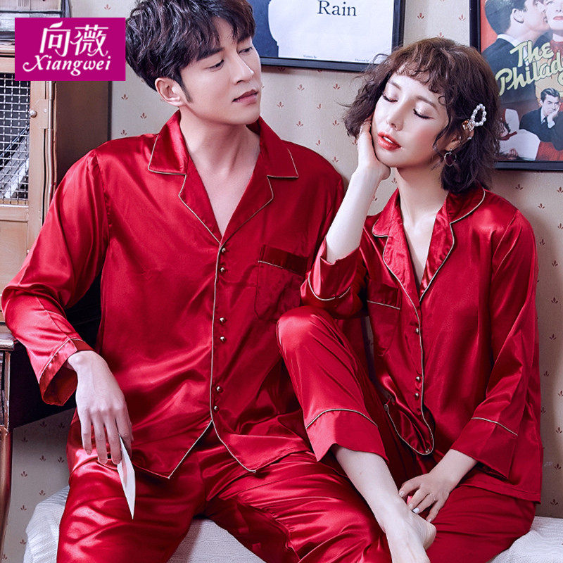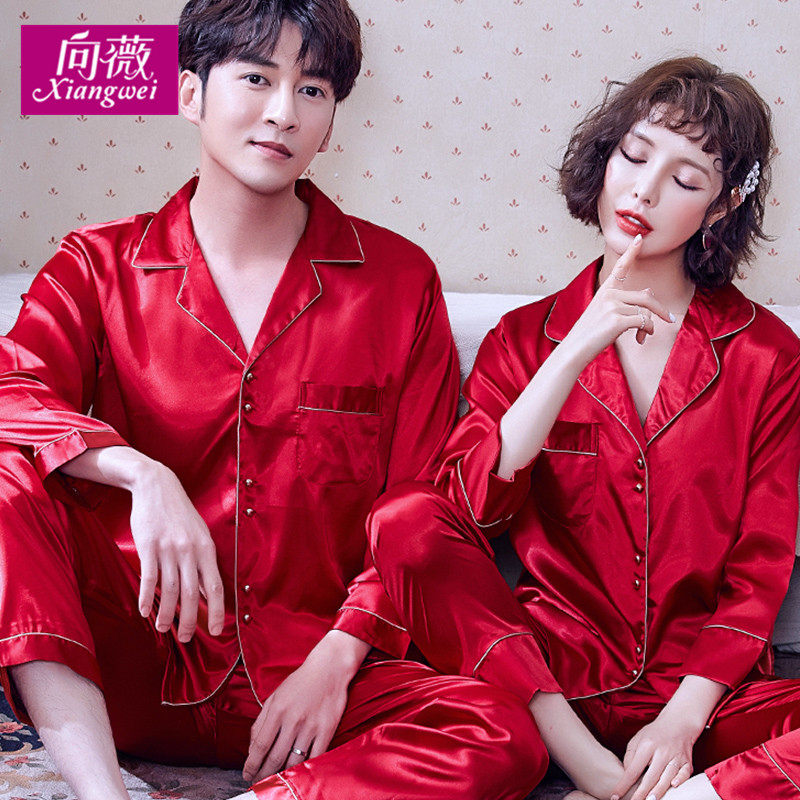结婚情侣睡衣女春秋长袖冰丝韩版睡衣男款新婚丝绸家居服套装夏季