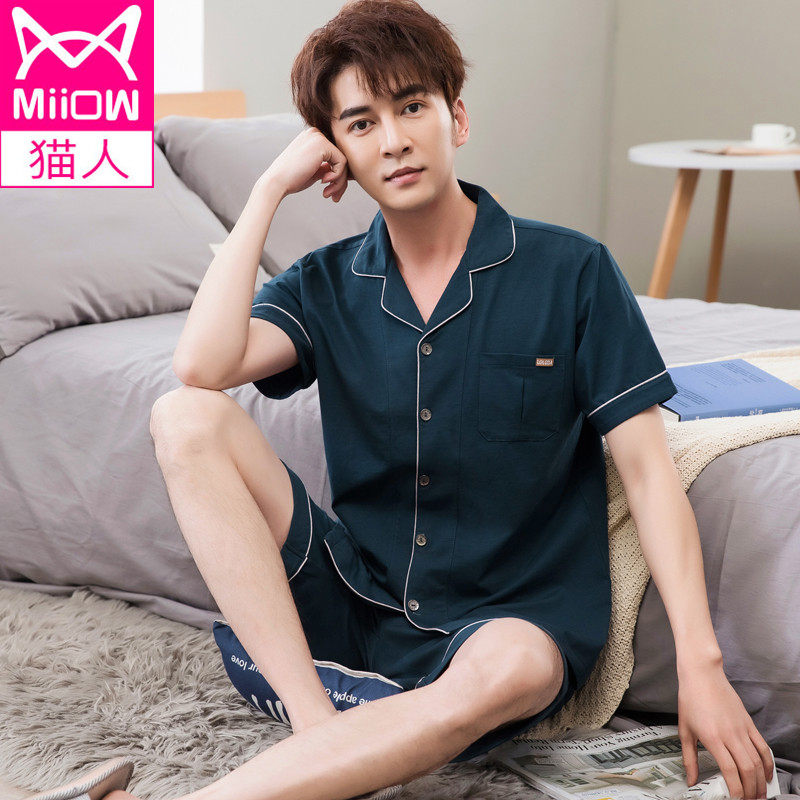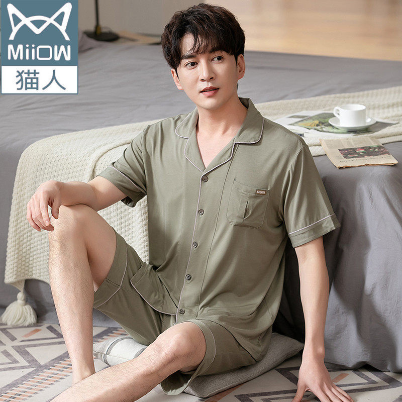 猫人莫代尔睡衣男士春夏薄款短袖短裤大码青中年开衫夏家居服套装