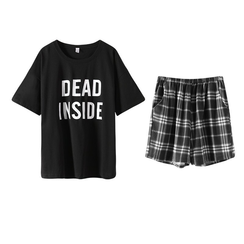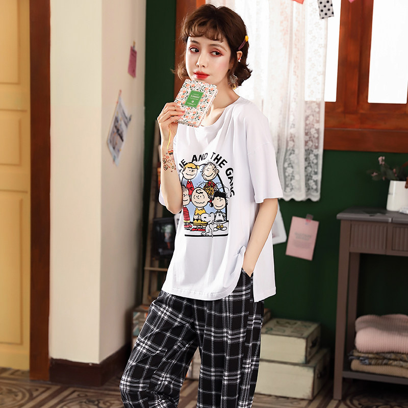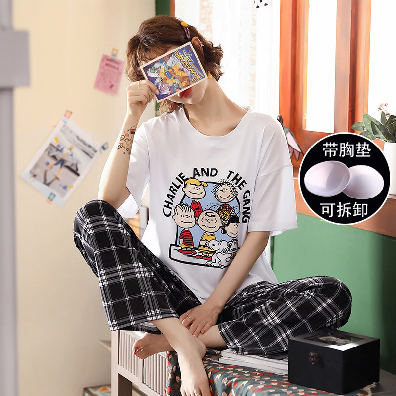 带胸垫睡衣女两件套夏季纯棉短袖大码家居服免穿文胸套装夏可外穿