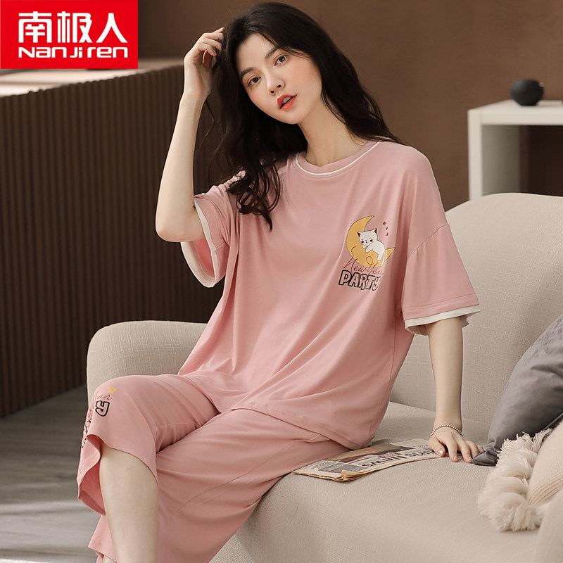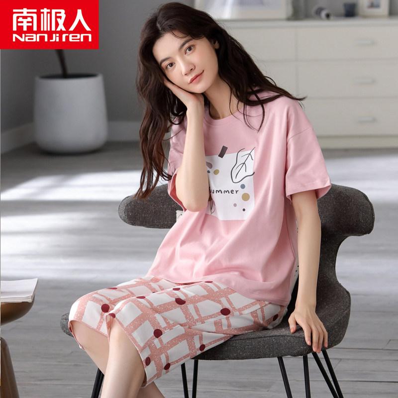 南极人2021年新款睡衣女夏季纯棉短袖大码两件套装春夏薄款家居服