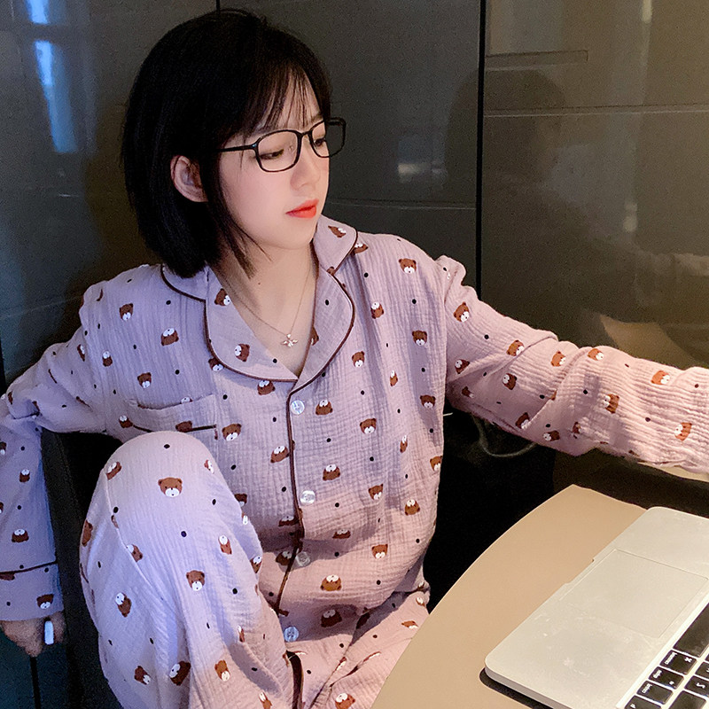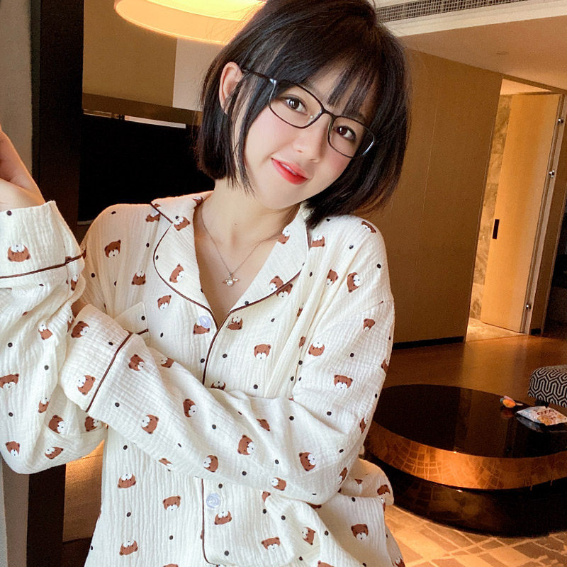 小熊睡衣女春秋长袖纯棉开衫薄款双层纱布韩版可爱棉纱家居服套装