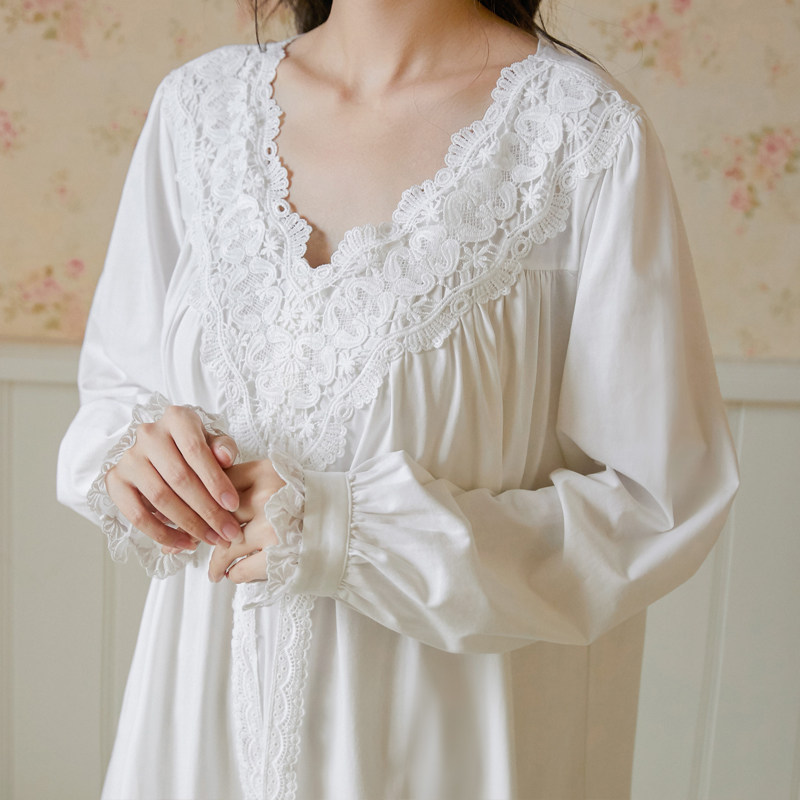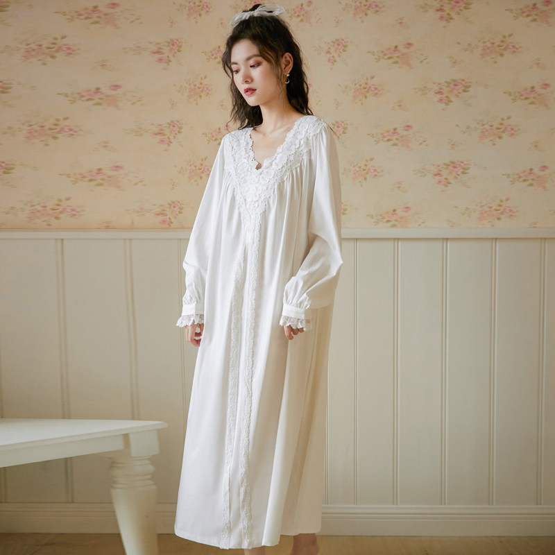 2021年长袖睡裙女夏白色纯棉法式大码公主风宫廷风夏季睡衣长款裙