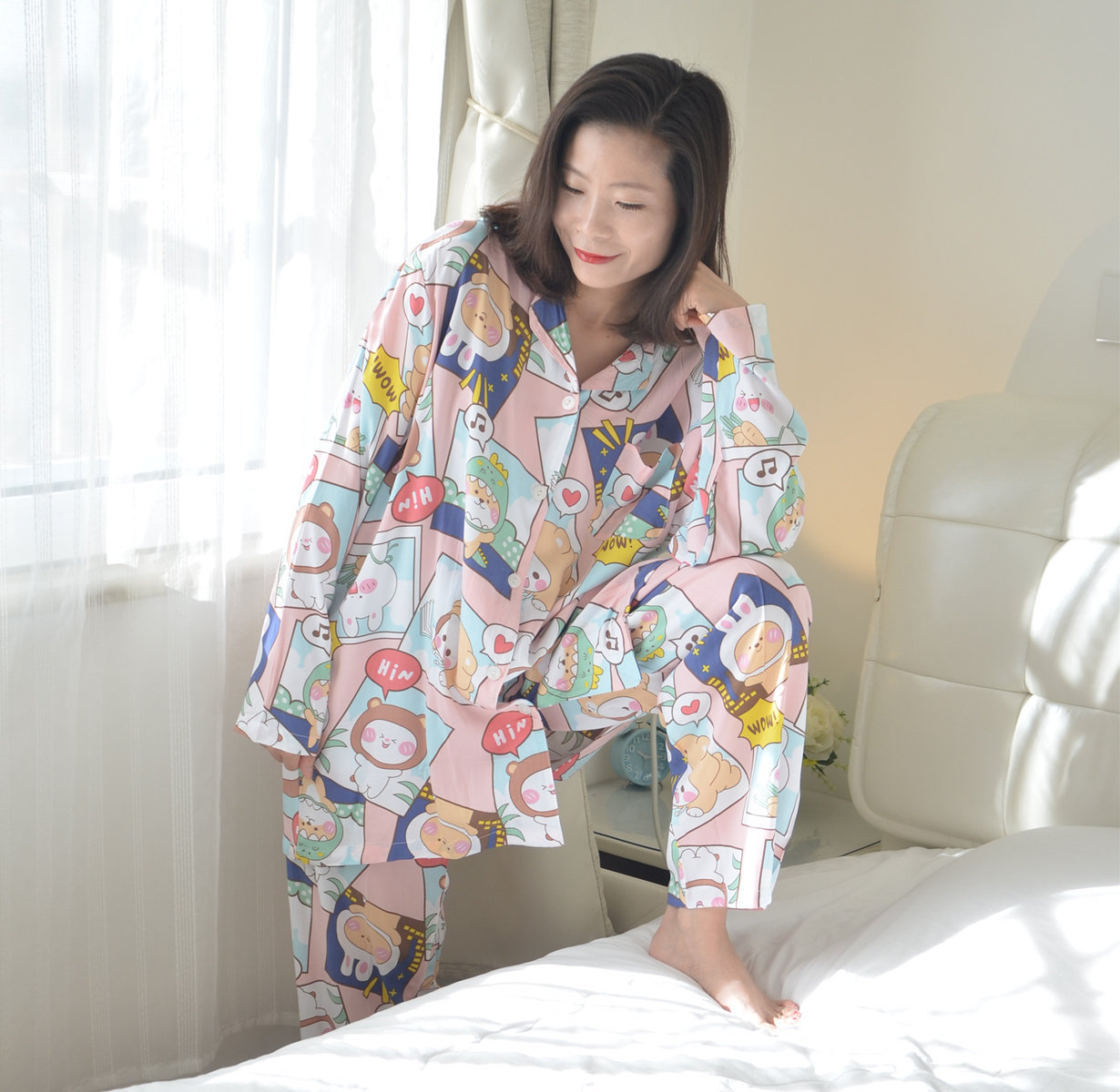 卡通熊大码绵绸睡衣女春秋长袖长裤开衫薄款胖MM宽松家居服200斤