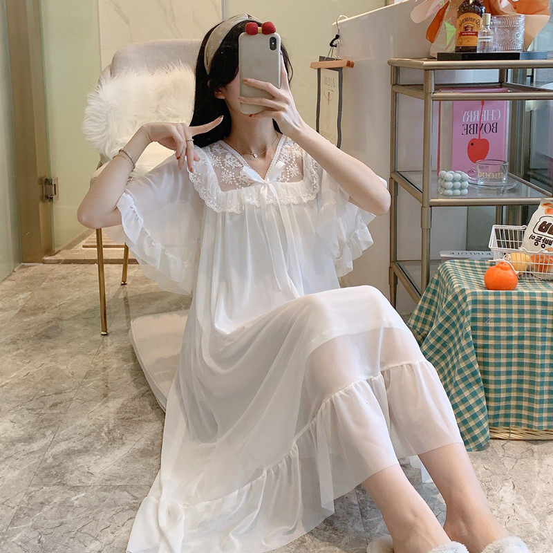 莫代尔宫廷睡裙女夏季新款短袖蕾丝网纱公主仙女风可爱睡衣夏长裙