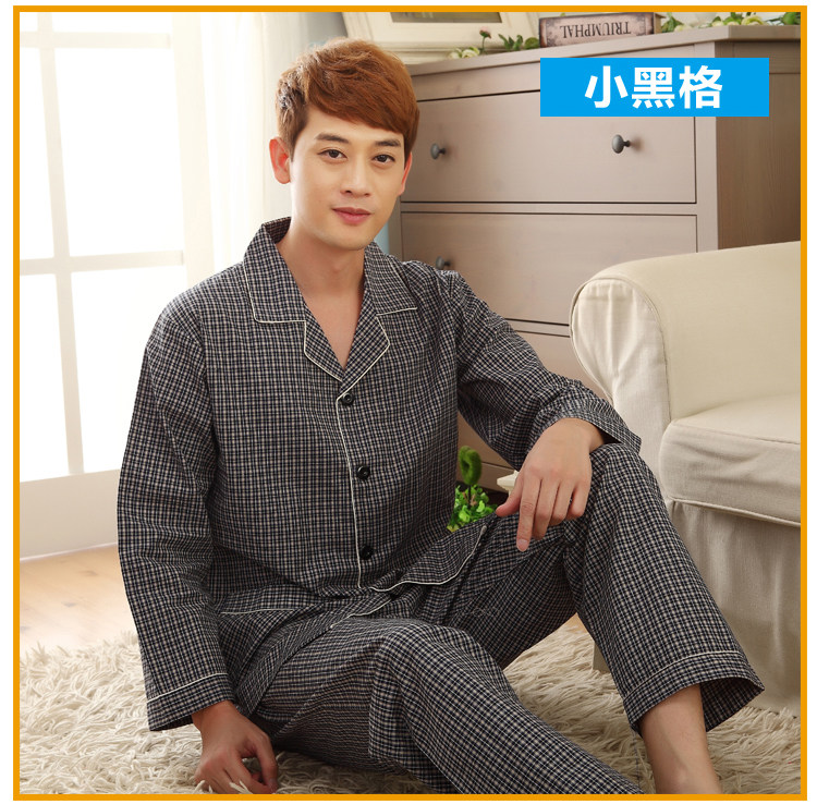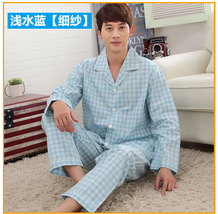春秋季梭织全棉老粗布睡衣加肥大码男长袖中老年全棉布格子家居服