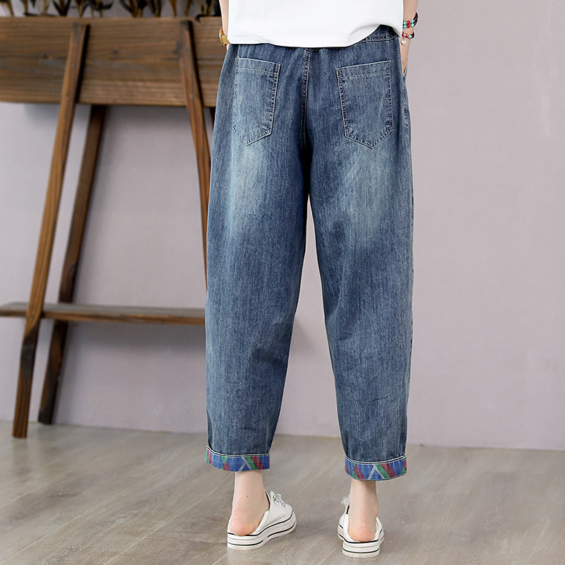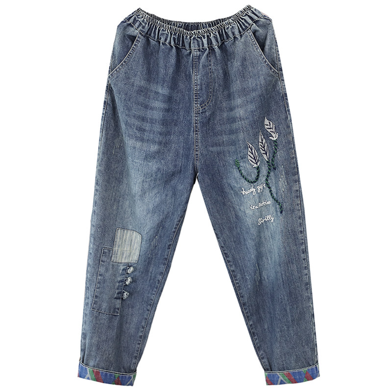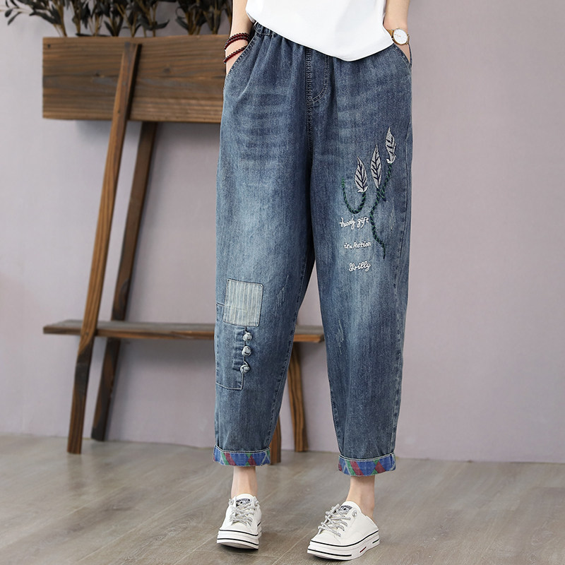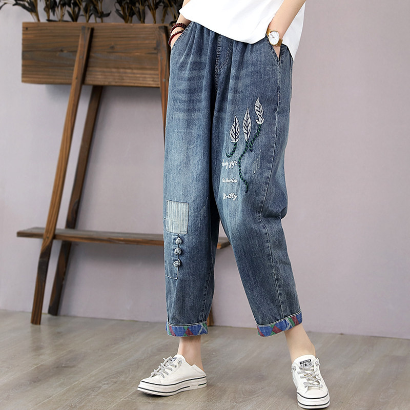 韩索依 复古文艺夏季新款刺绣树叶高腰牛仔裤女薄款直筒裤七分裤