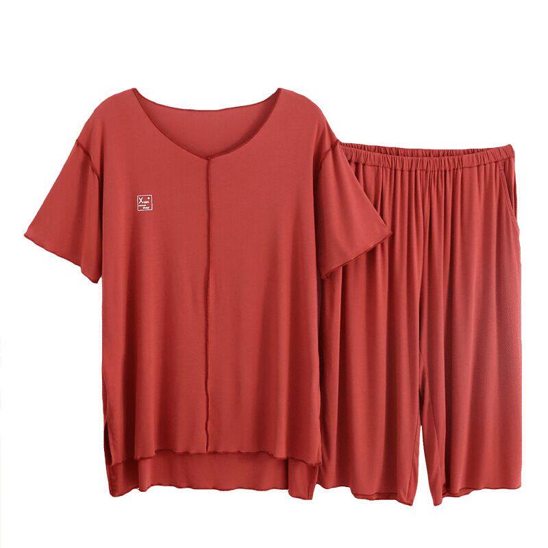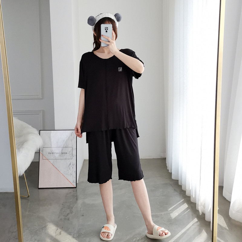 加大码简约V领莫代尔睡衣女夏季短袖中裤套装孕妇宽松胖mm家居服